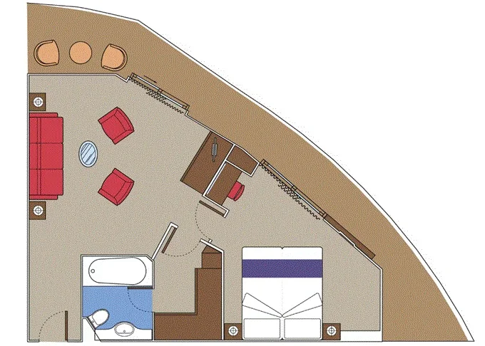 Suite s balkónom/panoramatickým oknom: 21-47m², (Royal 53m², Family 52m²)kajuta s manželskou posteľou (na požiadanie 2 oddelené postele) a rozkladacia pohovka. Klimatizácia, kúpeľňa s vaňou, toaletný stolík, priestorná skriňa, interaktívna TV, telefón, minibar, sejf, sušič na vlasy. Balkón so stolíkom a stoličkami/panoramatické okno. Internetové pripojenie (za poplatok).